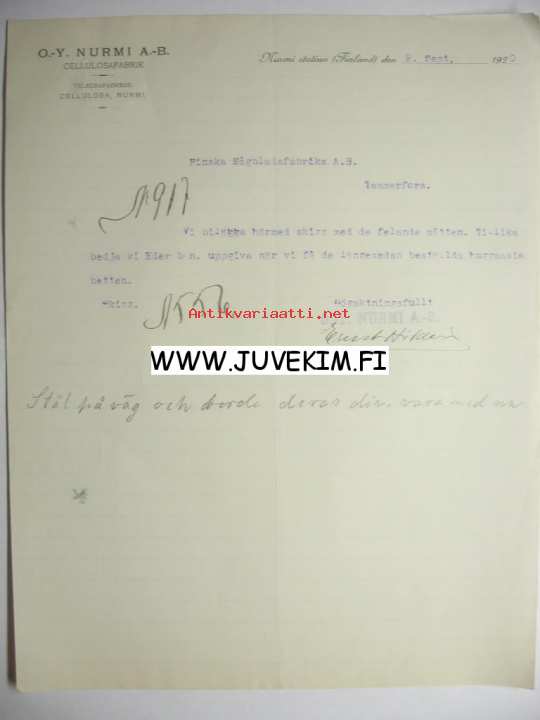 O.-Y. Nurmi A.-B. Nurmi 9.9.1920 -asiakirja