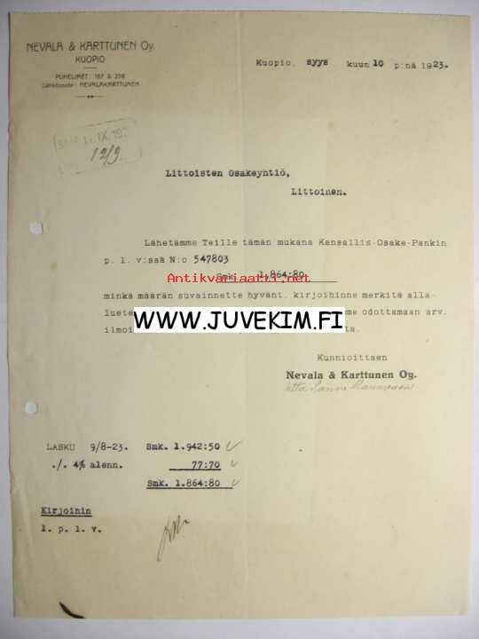 Nevala & Karttunen Oy Kuopio 16.9.1923 -asiakirja
