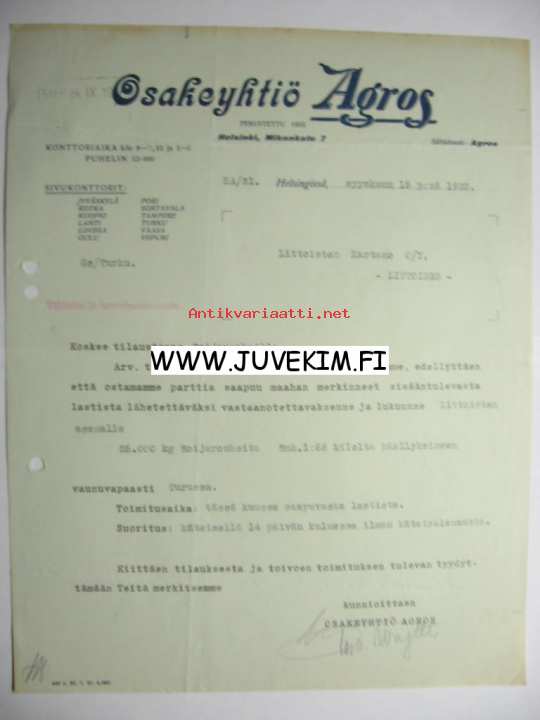 Osakeyhtiö Agros Helsinki 15.9.1923 -asiakirja