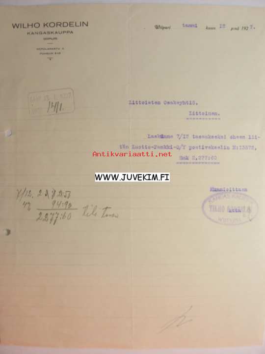 Wilho Kordelin Kangaskauppa Wiipuri 12.1.1927