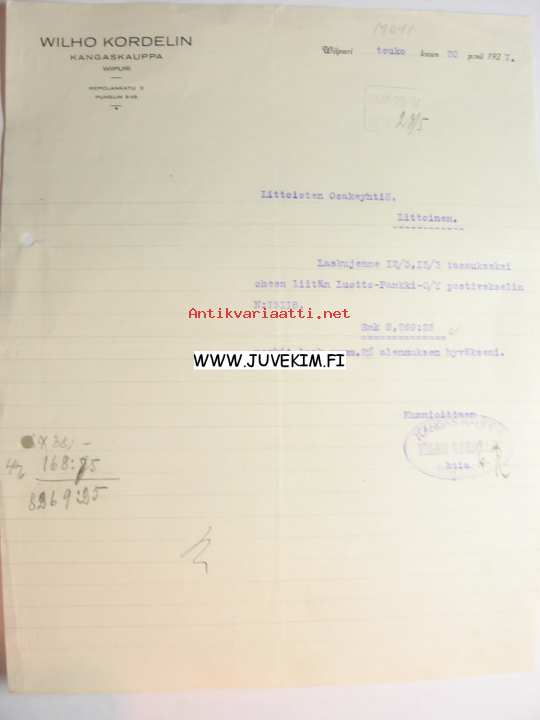 Wilho Kordelin Kangaskauppa Wiipuri 20.5.1927
