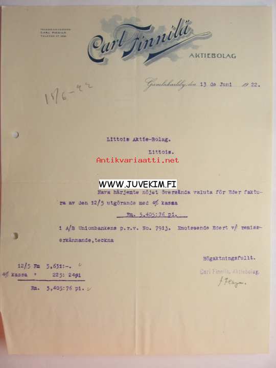 Carl Finnilä Aktiebolag Gamlakarleby/Kokkola 13.6.1922
