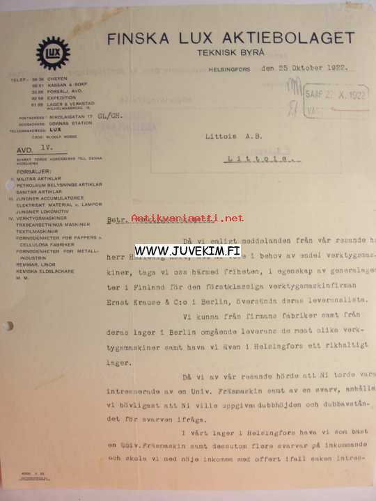 Finska Lux Aktiebolaget Helsingfors/Helsinki 22.10.1922