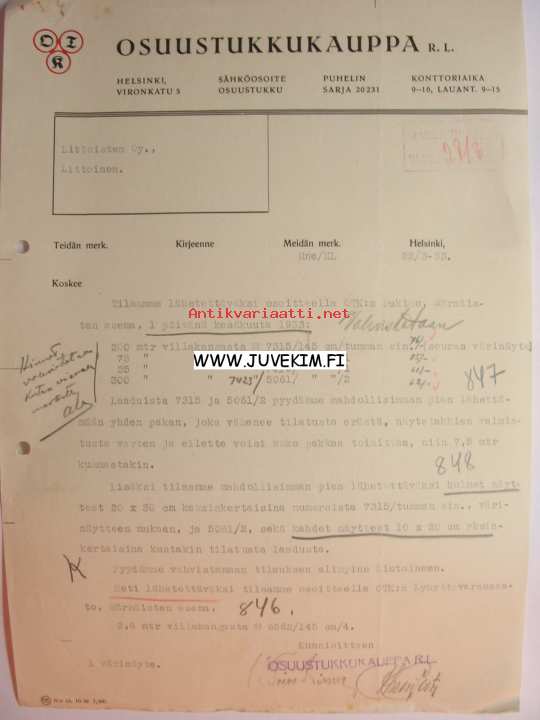 Osuustukkukauppa R.L Helsinki 22.3.1933