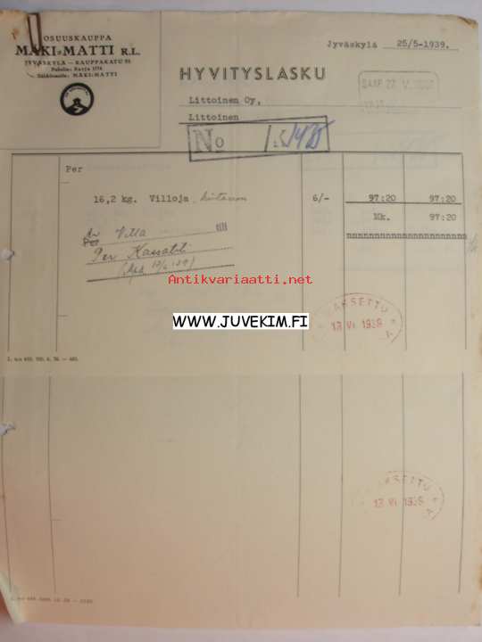 Osuuskauppa Mäki Matti R.L. Jyväskylä 25.5.1939