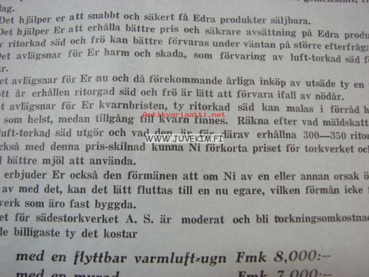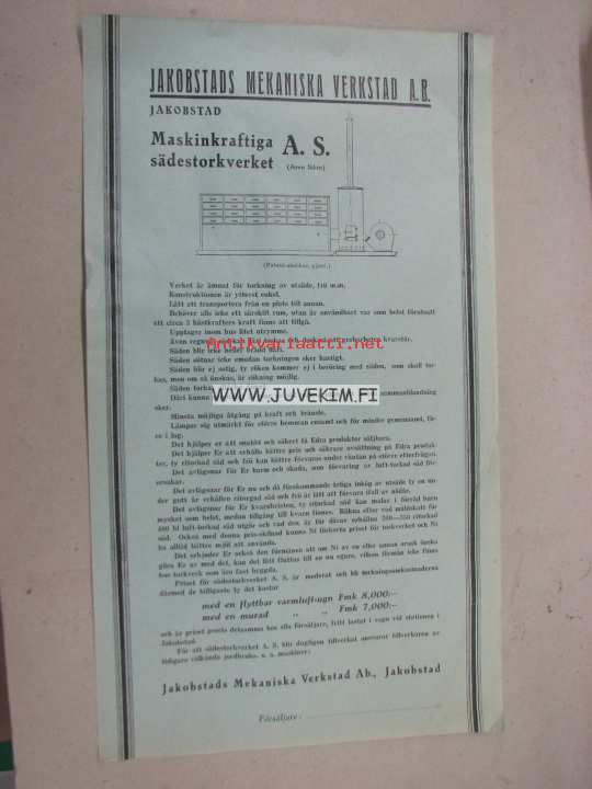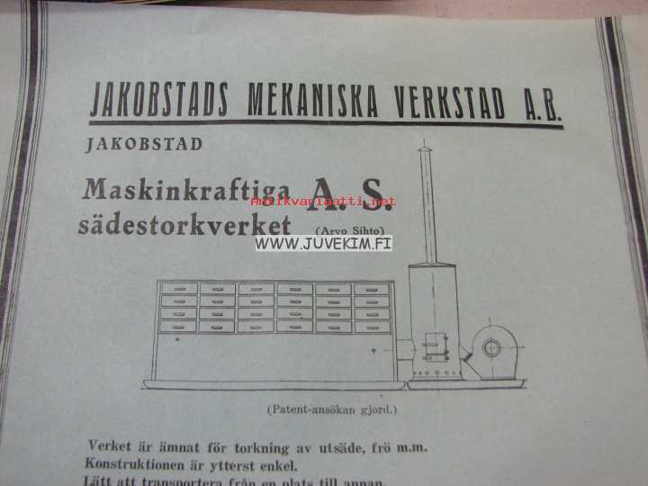 Jakobstads Mekaniska Verkstads Aktiebolag Maskinkraftiga sädestorkverket A.S. (Arvo Sihto) -myyntiesite