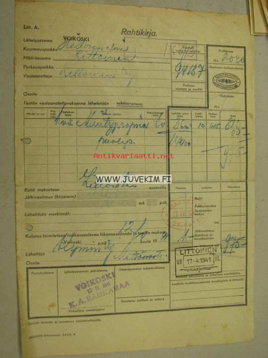 Littoinen Oy -VR rahtikirja leimattu; Voikoski