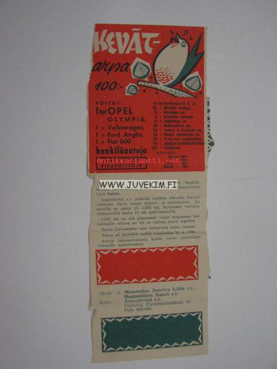 Kevätarpa 1959 Maaseudun Nuorten Liitto / Maalaisliiton Naiset -arpalippu