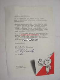 | Saatavilla | 1 kpl | | Julkaisuvuosi | 195? | | Sivuja | 1 | | Kunto | K2 | | Kielet | Suomi |