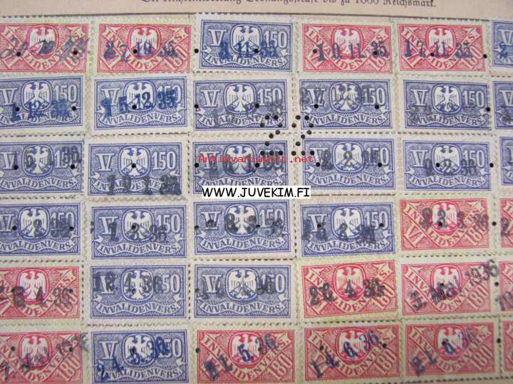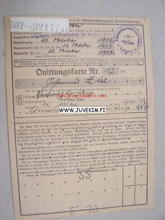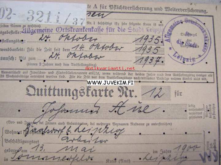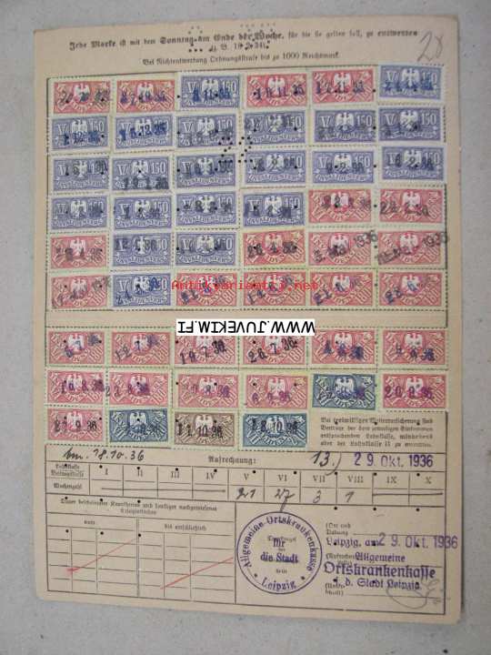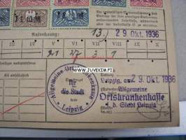 Allgemeine Ortskrankenkasse für die Stadt Leipzig -saksalainen vakuutuskortti maksumerkkeineen (joissa natsikotkahahmo)