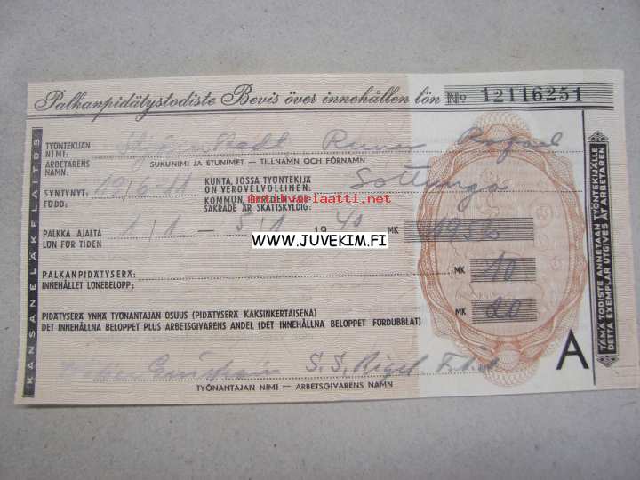 Palkanpidätystodiste Kansaneläkelaitos -kuitti 1940 FÅA SS RIGEL