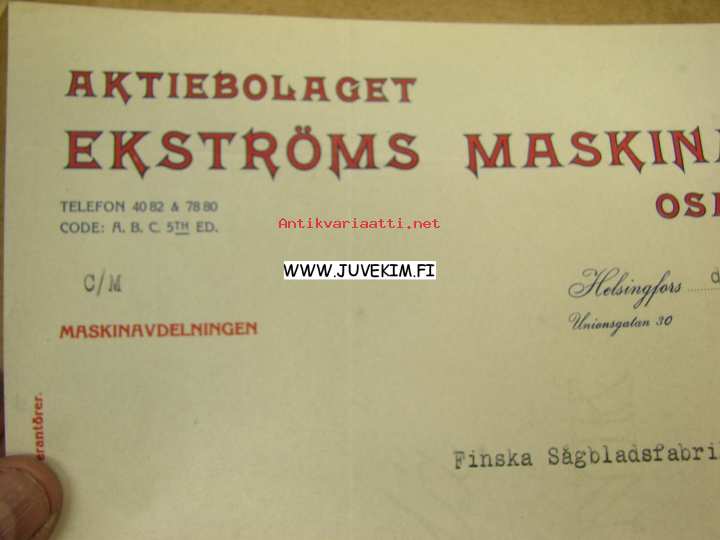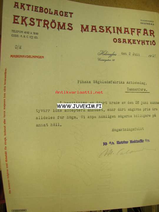 Aktiebolag Ekström Maskinaffär Osakeyhtiö 2.6.1918 -asiakirja