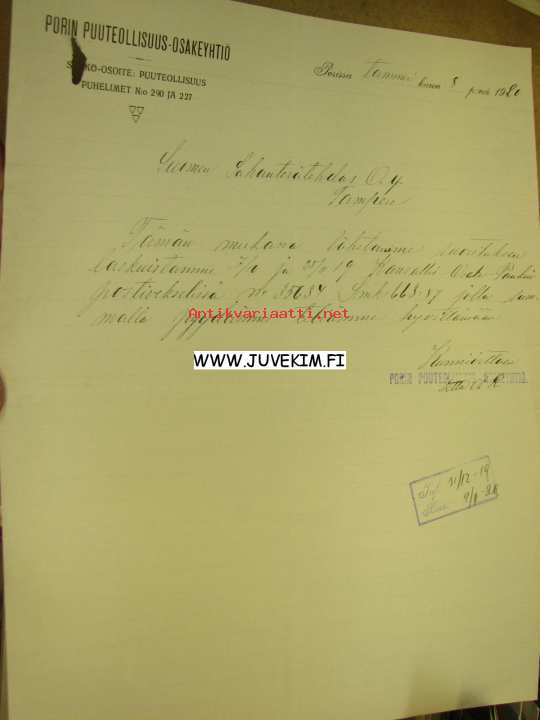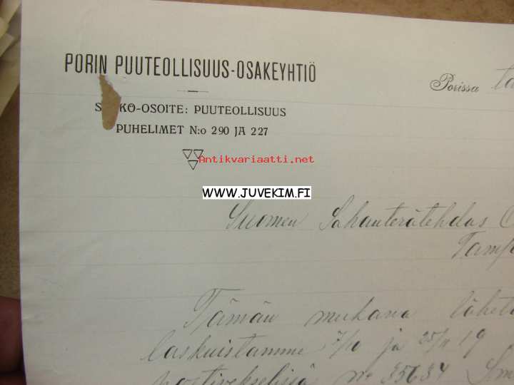 Porin Puuteollisuus-Osakeyhtiö Pori 8.1.1920 -asiakirja