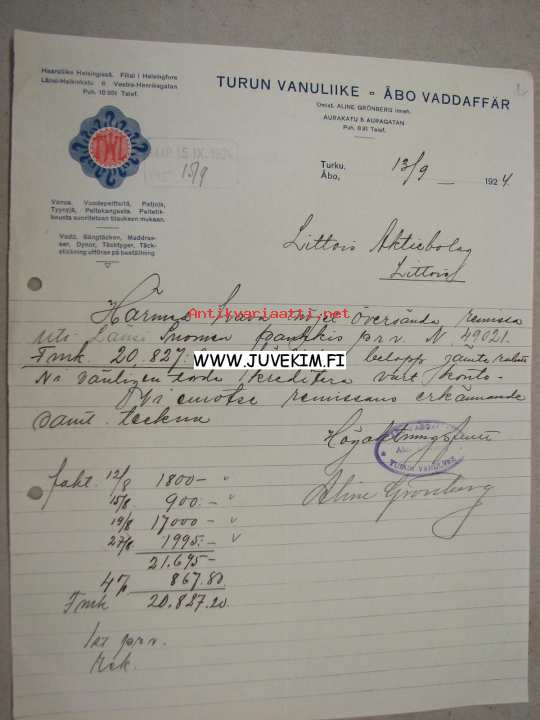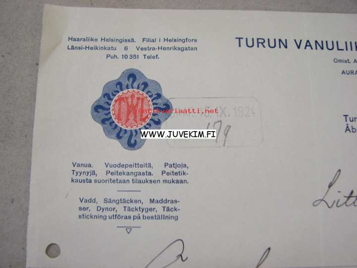 Turun Vanuliike - Åbo Vaddaffär, Turku, 13.9.1924 -asiakirja