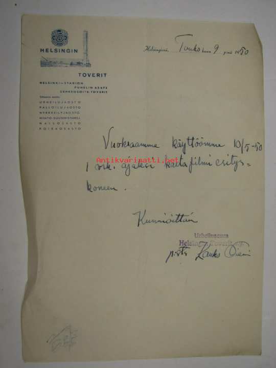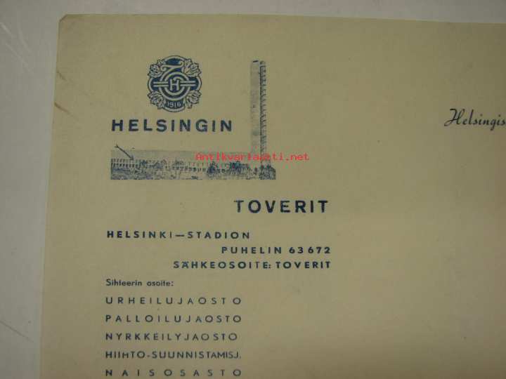 Helsingin Toverit Helsinki Stadion 9.5.1950 -asiakirja