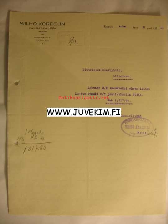 Wilho Kordelin kangaskauppa Wiipuri 3.10.1925 -asiakirja