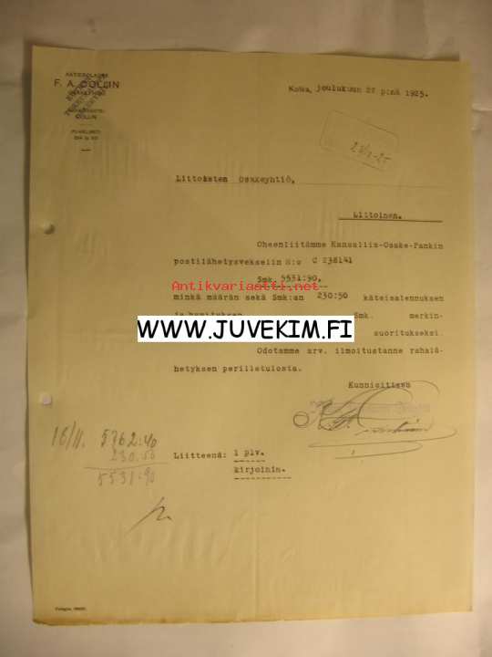 Aktiebolaget F. A. Collin Kotka 22.12.1925 -asiakirja