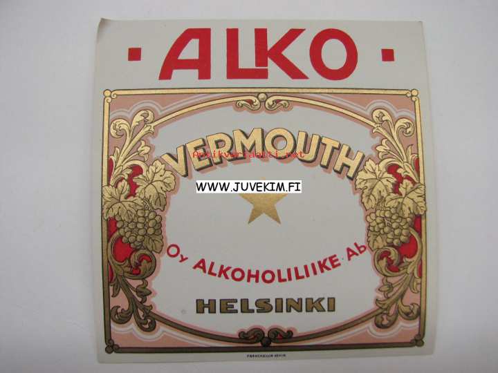 Alko Vermouth -viinaetiketti 1930-luvulta (3 tähteä, punainen)