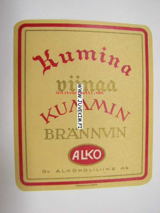 Kumina viinaa Kummin brännvin -viinaetiketti 1930-luvulta