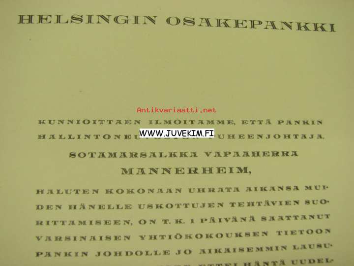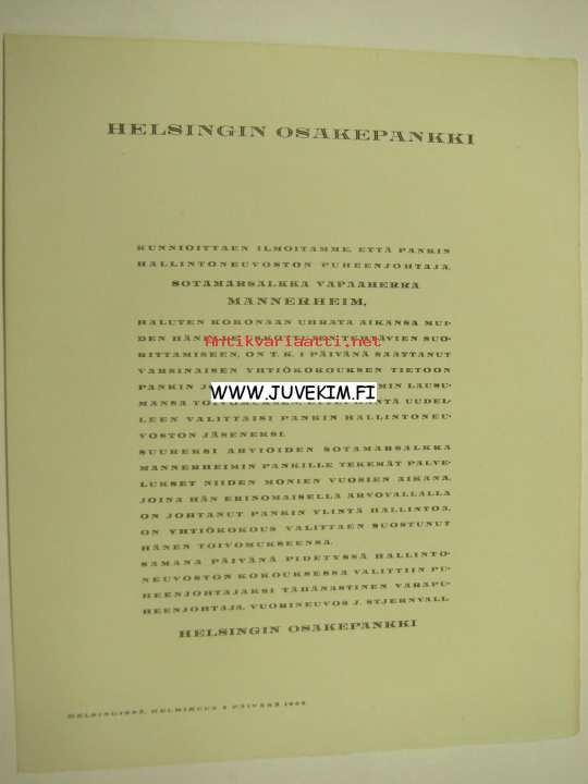 Helsingin Osakepankki, ilmoitus Sotamarsalkka, vapaaherra Mannerheimin erosta pankin hallinnosta 2.2.1935