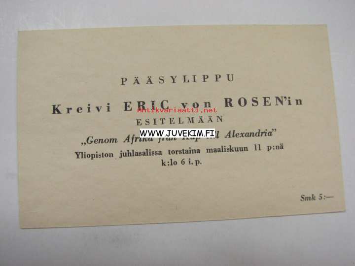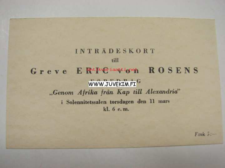 Pääsylippu Kreivi Eric von Rosen´in esitelmään "Genom Afrika från Kap till Alexandria"