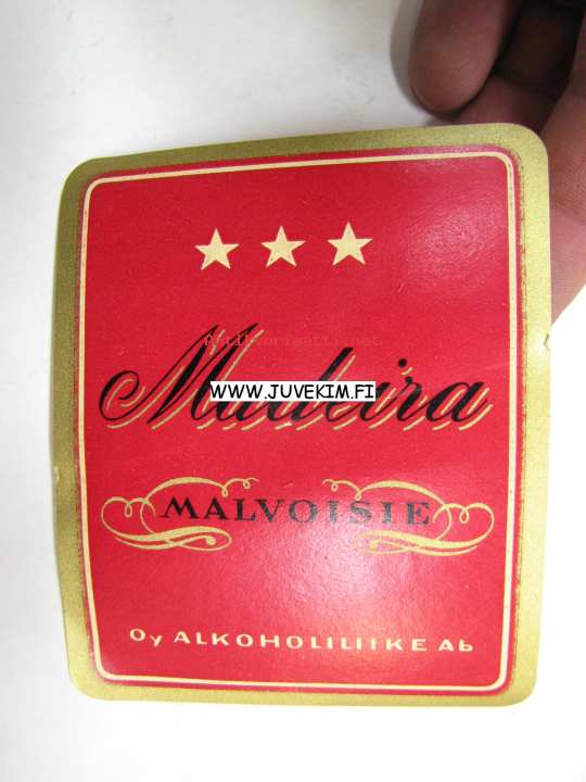 Alko Madeira finest old Malvoisie -viinaetiketti 1930-luvulta ( punainen, kolme tähteä)