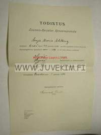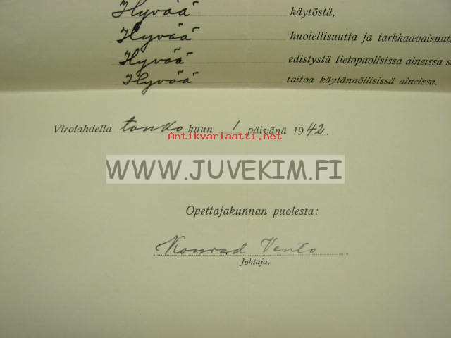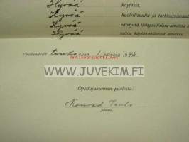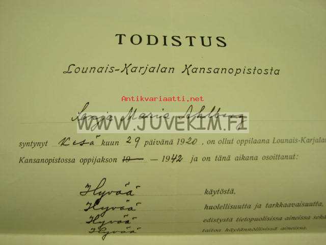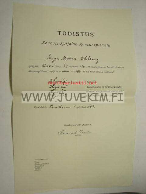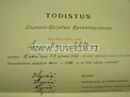 Lounais-Karjalan Kansanopisto, Virolahti, 194223 x 34 cm todistus.