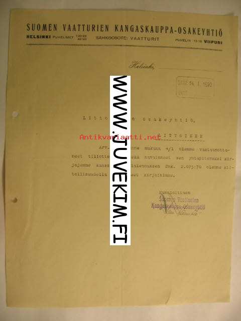 Suomen Vaatturien Kangaskauppa - Osakeyhtiö Helsinki 14.1.1920 -asiakirja