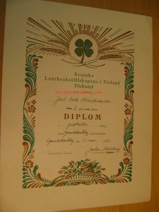Diplom, I pris potatis-odling inom Gamlakarleby lantbruksklubb 1947
