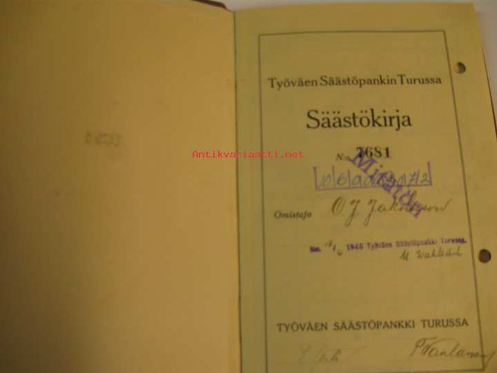 Otto Johannes Jakobssonin vastakirja, 11 x 17 cm. Merkintöjä 8 sivua, loppuosassa Työväen Säästöpankin Turussa säännöt, Turun Säästöpankin säännöt 23 sivua.