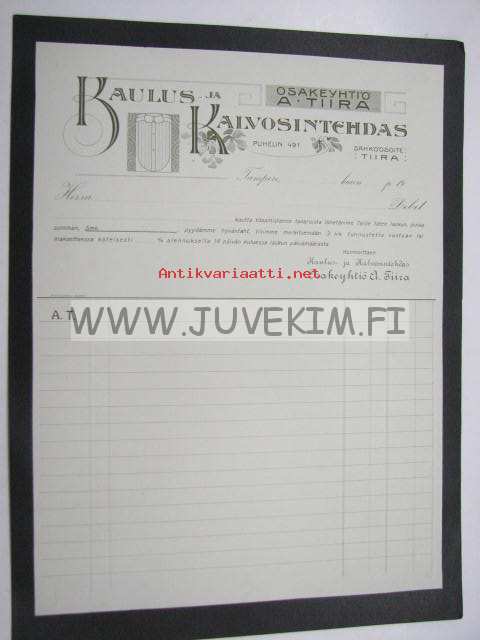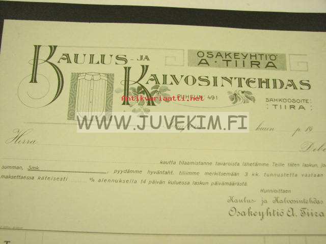 Kaulus- ja Kalvosintehdas A. Tiira -kirjapainon lomakemalli