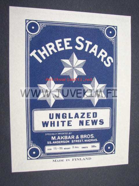 Three Stars -suomalaisen paperiteollisuuden pakkausetiketti