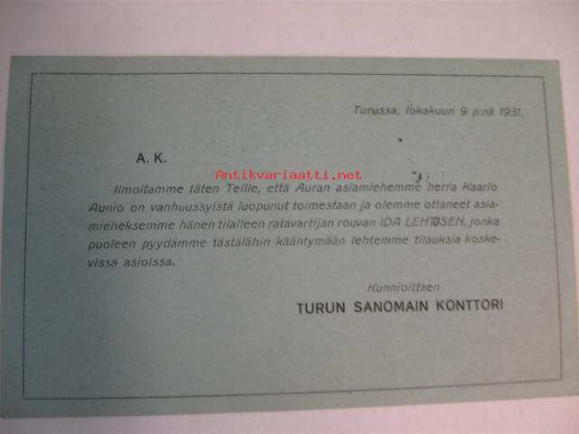 Turun Sanomat, ilmoitus Auran asiamiehen vaihtumisesta v.1931