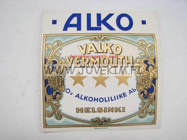 Alko Valko Vermouth -viinaetiketti 1930-luvulta