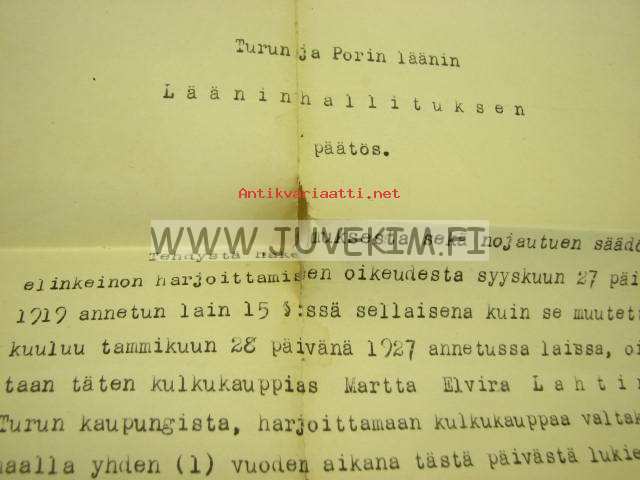 Kulkukauppiaslupa koko maa Martta Elvira Lahtinen 1939 -asiakirja