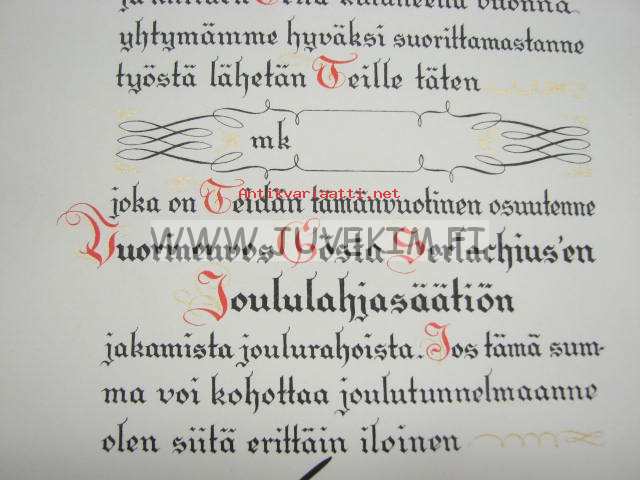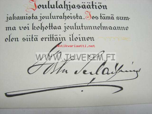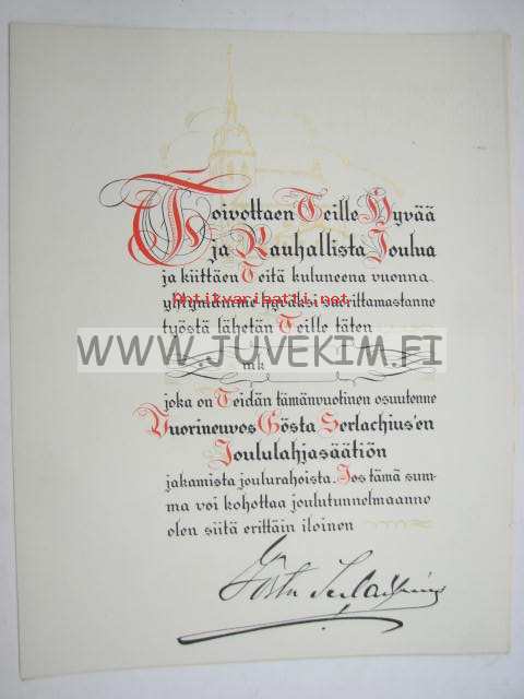 Vuorineuvos Gösta Serlachius`en Joululahjasäätiö -lahjakirja