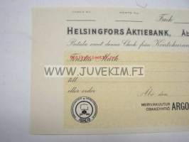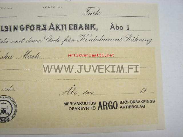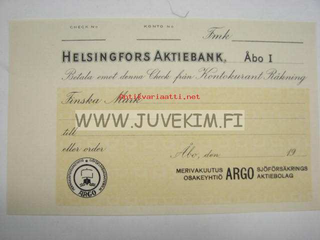 Helsingfors Aktiebank, Åbo I, Check / Merivakuutus Oy ARGO Sjöförsäkrings Ab -shekki, blanco