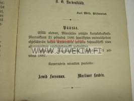 | Saatavilla | 1 kpl | | Julkaisuvuosi | 1887 | | Sivuja | 7 | | Kunto | K3 | | Kielet | Suomi |