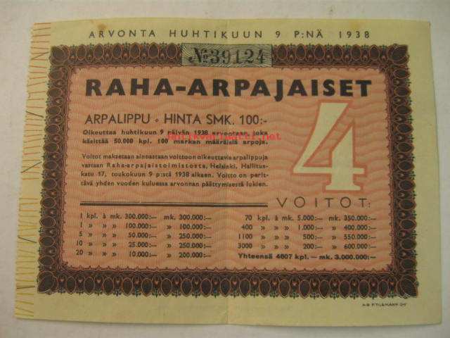 Raha-arpajaiset 9.4.1938 -arpalippu