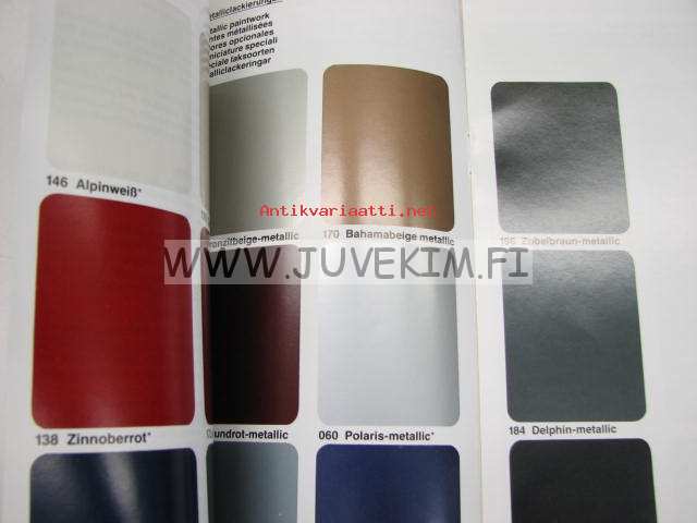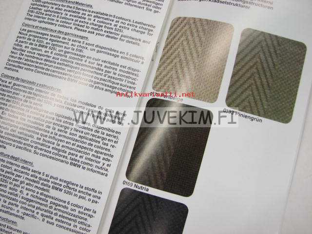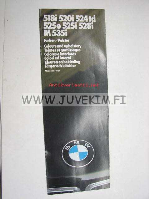 BMW 518i 520i 524td 525e 525i 528i M535i Farben/Polster Colours and upholstery -väri- ja verhousmallit mallivuosi 1985