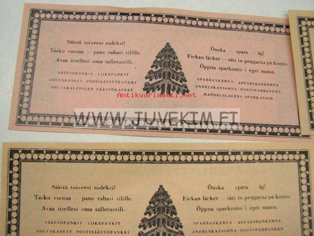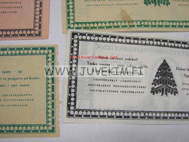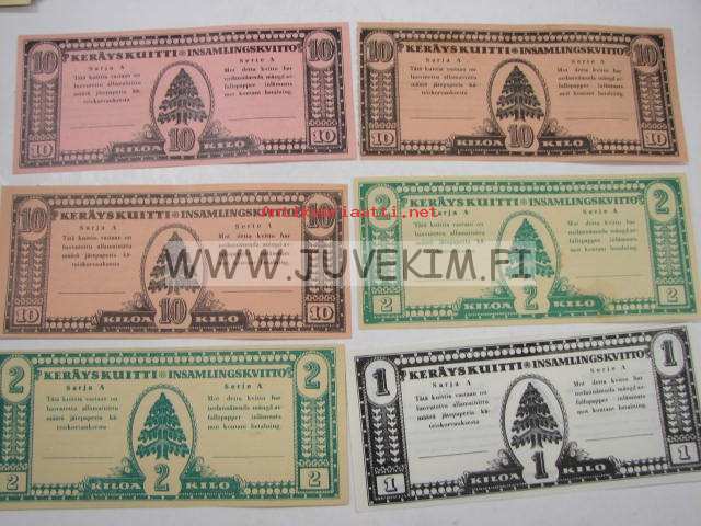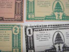 196 kpl eri kilomääristä saatuja keräyskuitteja, joita sai sitten vaihtaa erilaisiin tavaroihin.