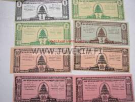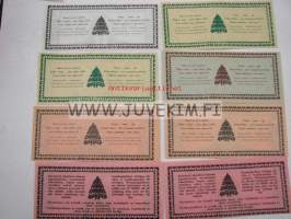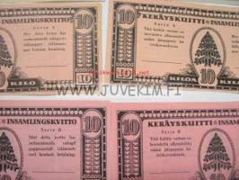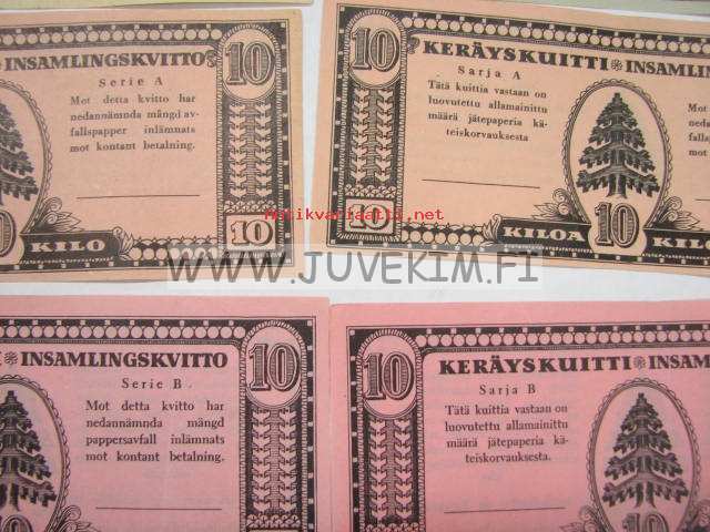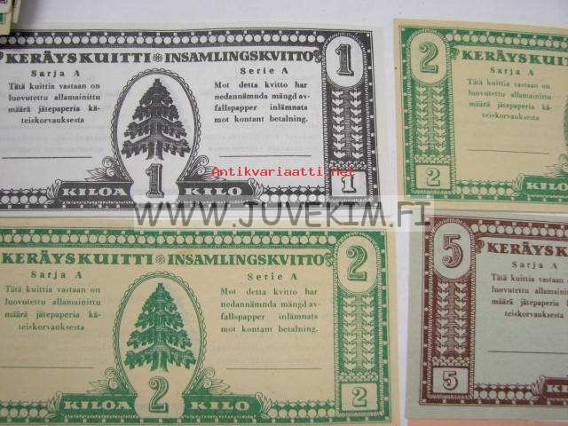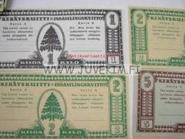 198 kpl eri kilomääristä saatuja keräyskuitteja, joita sai sitten vaihtaa erilaisiin tavaroihin.