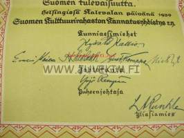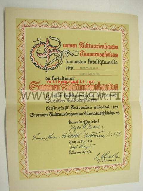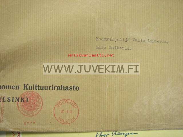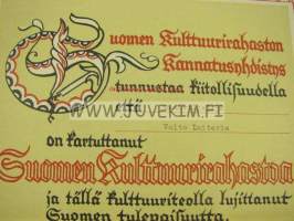 Suomen Kultturirahasto, kiitoskirja lahjoituksesta maanviljelijä Valto Laiterla 1939