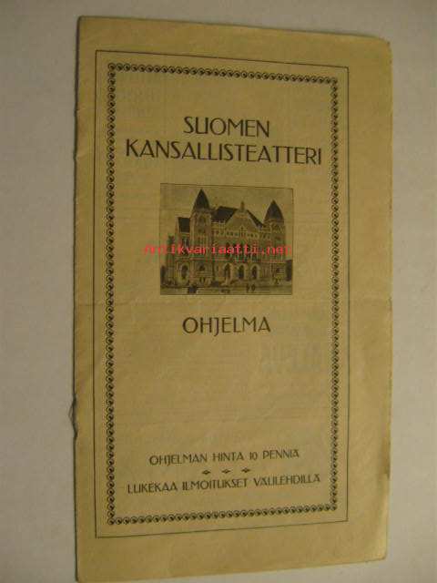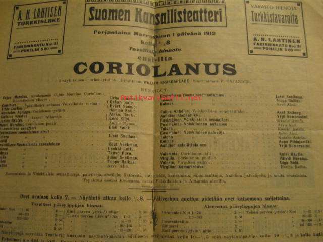 Suomen Kansallisteatteri , 191213,4 x 22,7 cm ohjelmalehtinen. Coriolanus - 5-näytöksinen murhenäytelmä, kirjoittanut Shakespeare.