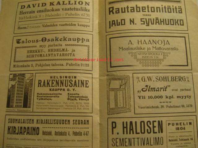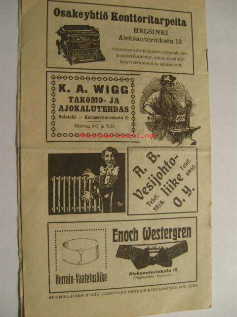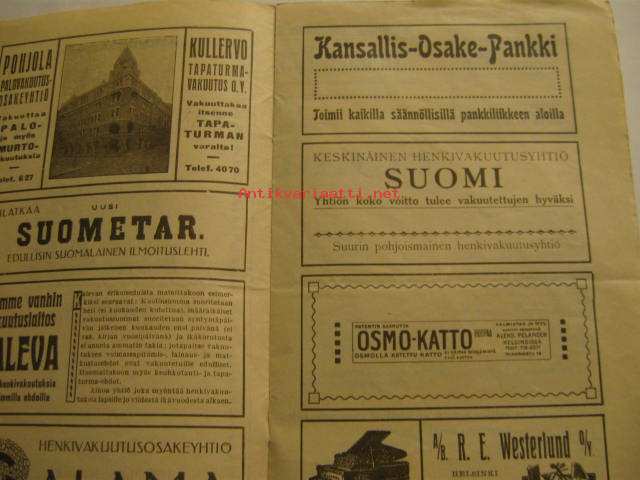 | Saatavilla | 1 kpl | | Julkaisuvuosi | 1912 | | Sivuja | 8 | | Kunto | K2 | | Kielet | Suomi |