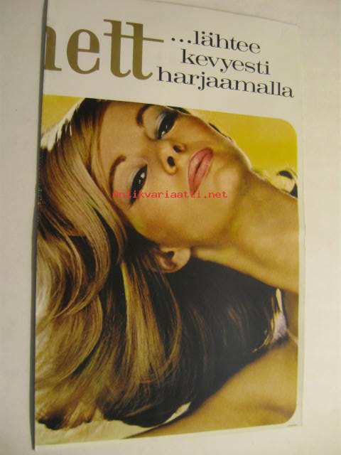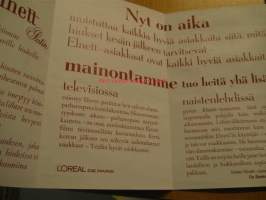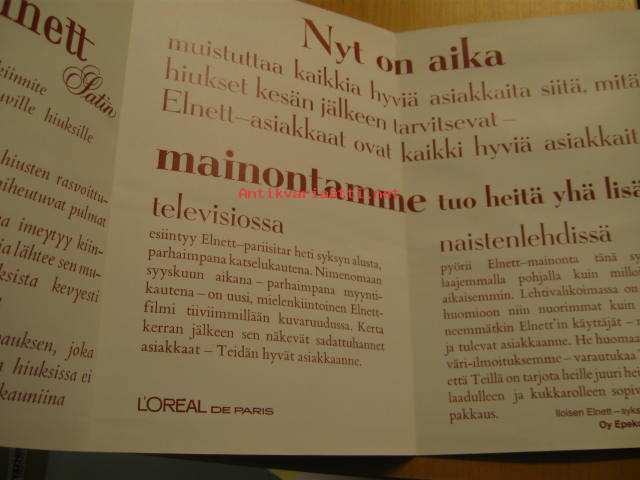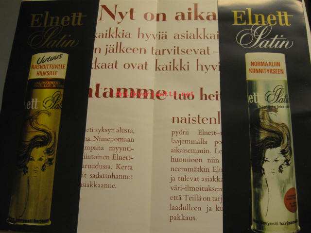 Oy Epeko Ab, 19Elnett hiuskiinteen myyntiesite vähittäiskauppiaille. Kokoon taitettuna 32,5 x 20,5 cm.