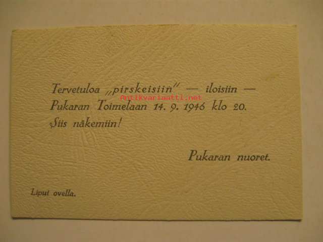 Tervetuloa "pirskeisiin" - iloisiin - Pukaran Toimelaan 14.9.1946 Pukaran nuoret