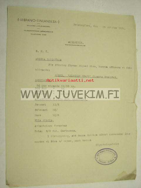 Oy Hispano-Finlandesa Ab Helsinki 24.10.1932 -asiakirja