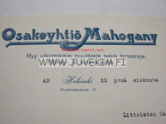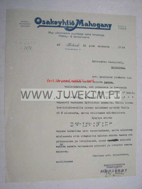 Osakeyhtiö Mahogany Helsinki 22.8.1924 -asiakirja