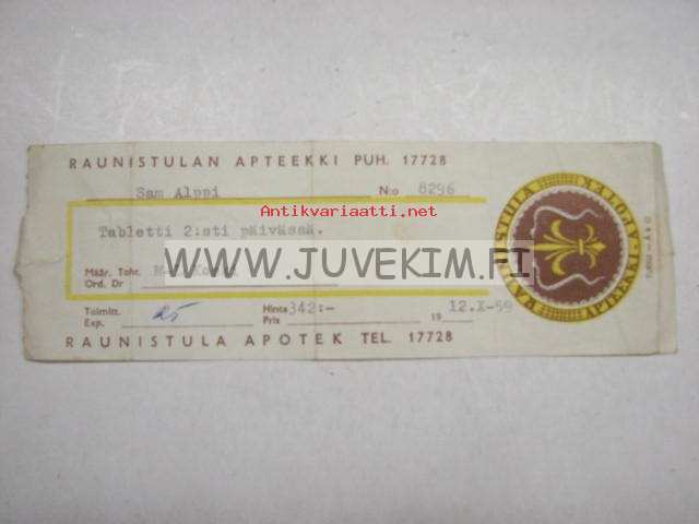 Raunistulan Apteekki Turku 12.10.1959 -apteekkisignatuuri
